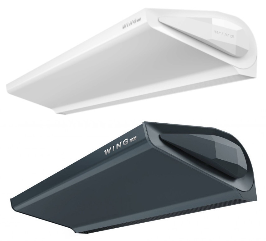 Kurtyna powietrza WING o szerokości 100cm, 150cm lub 200cm. Występująca w wariantach z nagrzewnicą wodną lub elektryczną oraz bez nagrzewnicy. Dostępna kolorystyka: biała (RAL9016) oraz szara (RAL7016).