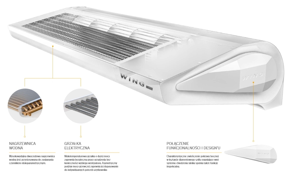 Kurtyna powietrza WING o szerokości 100cm, 150cm lub 200cm. Występująca w wariantach z nagrzewnicą wodną lub elektryczną oraz bez nagrzewnicy. Dostępna kolorystyka: biała (RAL9016) oraz szara (RAL7016).